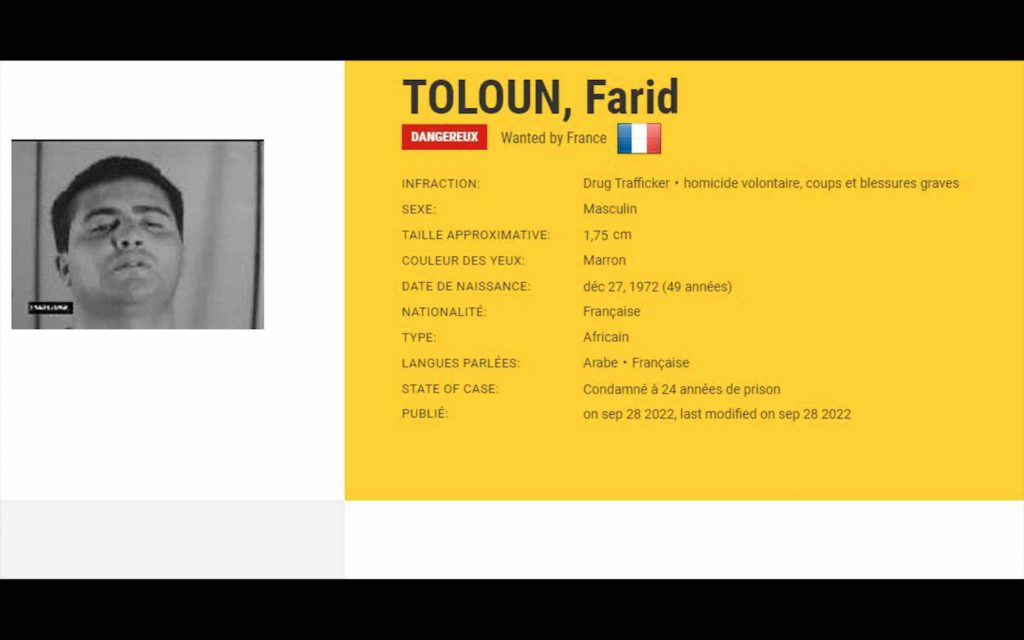 Farid Toloun, Lyonnais d’origine marocaine, condamné à 24 ans de prison pour homicide volontaire et impliqué dans plusieurs affaires de coups et blessures graves, est activement recherché par la France. Il est l’un des criminels les plus recherchés d’Europe.