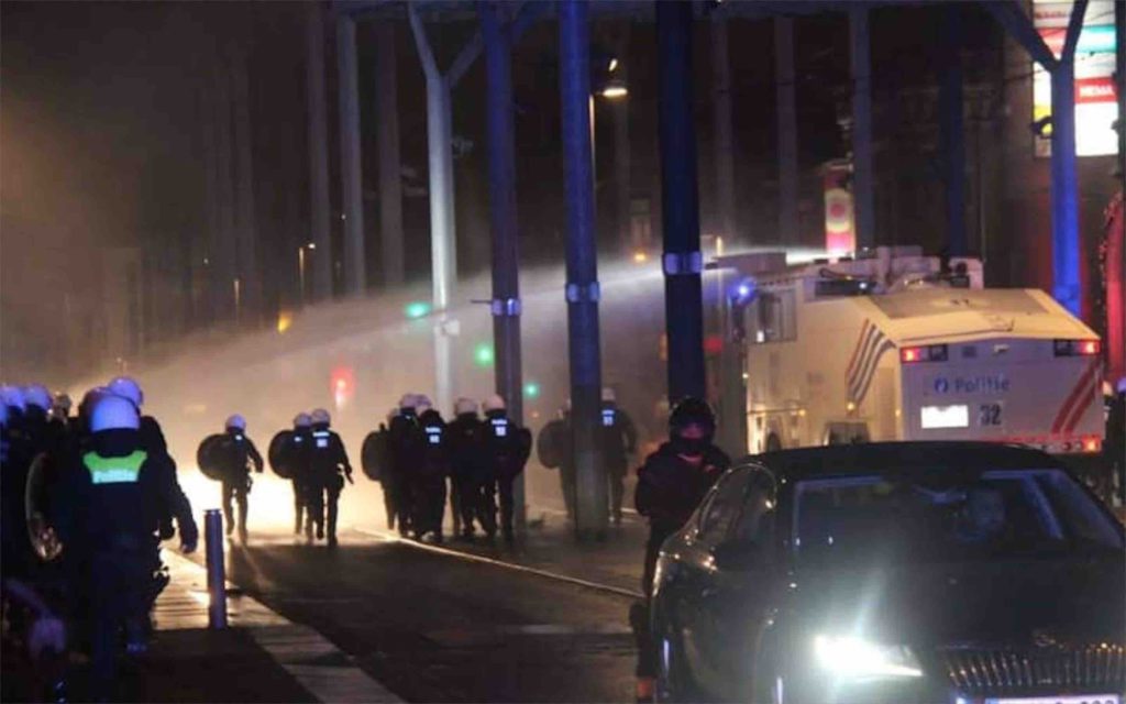 « Nous avons observé une utilisation massive de matériel pyrotechnique. Nos services sont immédiatement intervenus pour des petits groupes d’émeutiers qui ont lancé des projectiles vers les services de l’ordre et utilisé des feux d’artifice dans les quartiers du Boulevard Poincaré et du square de l’aviation à Bruxelles et sur la place Bara à Anderlecht ».