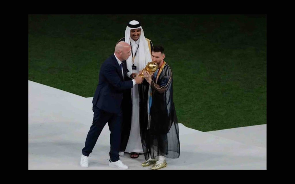 Dimanche soir, en direct sur BFM TV, les journalistes sportifs qui commentaient la remise du trophée de la Coupe du monde à l’équipe argentine ont manqué de s’étouffer lorsque l’émir du Qatar a habillé Leo Messi d’un Bisht avant de lui remettre le précieux trophée.